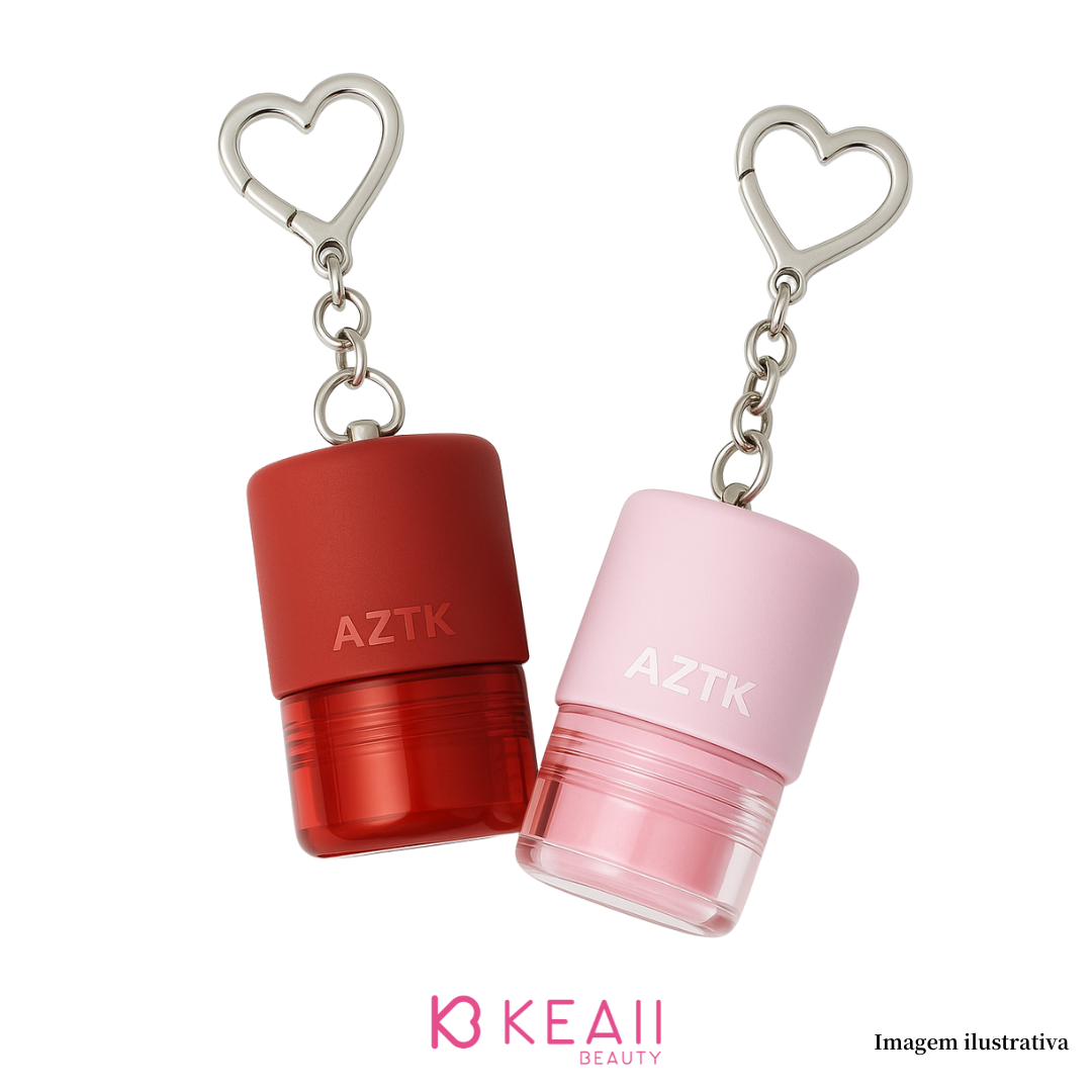 O AZTK é uma inovação chinesa em beleza portátil e multifuncional. Compacto, fofo e prático, ele combina batom e gloss em um único produto, com design exclusivo de cápsula e chaveiro em formato de coração, perfeito para levar pendurado na bolsa, celular ou crachá estilo e praticidade em qualquer lugar.